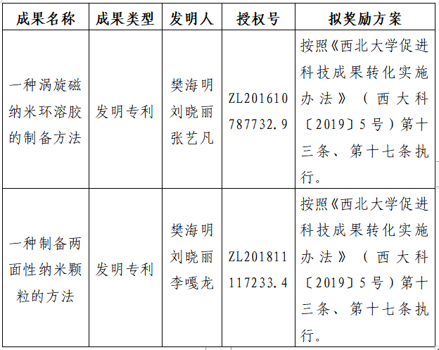 按照《乐投平台促进科技成果转化实施办法》(西大科〔2019〕5号)相关规定,拟对乐投(中国)一站式服务平台化学与材料科学学院樊海明教授作为成果负责人的2项发明专利权实施转化,现将相关信息公示如下: