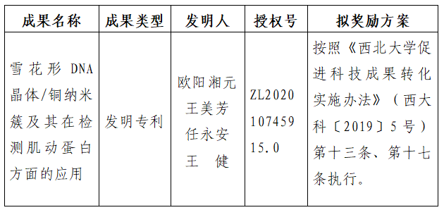 按照《乐投平台促进科技成果转化实施办法》(西大科〔2019〕5号)相关规定,拟对乐投(中国)一站式服务平台化学与材料科学学院欧阳湘元副教授作为成果负责人的1项发明专利权实施转化,现将相关信息公示如下: