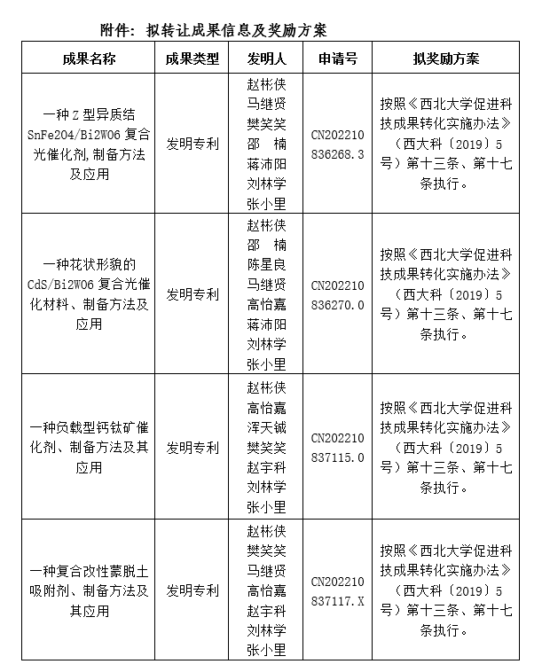 按照《乐投平台促进科技成果转化实施办法》(西大科〔2019〕5号)相关规定,拟对乐投(中国)一站式服务平台化工学院赵彬侠教授作为成果负责人的4项专利申请权实施转化,现将相关信息公示如下:
