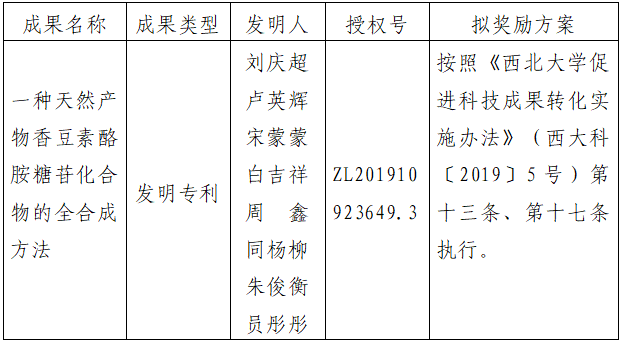 按照《乐投平台促进科技成果转化实施办法》(西大科〔2019〕5号)相关规定,拟对乐投(中国)一站式服务平台化工学院刘庆超教授作为成果负责人的1项发明专利权实施转化,现将相关信息公示如下: