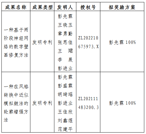 按照《乐投平台促进科技成果转化实施办法》(西大科〔2019〕5号)相关规定,拟对乐投(中国)一站式服务平台艺术学院彭先霖老师作为成果负责人的2项发明专利权实施转化,现将相关信息公示如下: