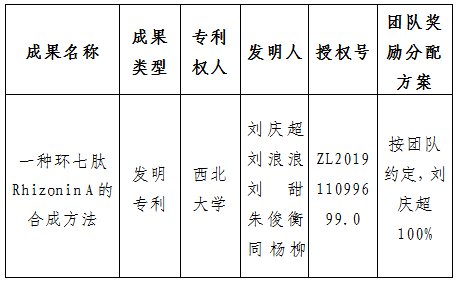 按照《乐投平台促进科技成果转化实施办法》(西大科〔2019〕5号)相关规定,拟对乐投(中国)一站式服务平台化工学院刘庆超教授作为成果负责人的1项发明专利权实施转化,现将相关信息公示如下:
