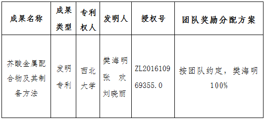 按照《乐投平台促进科技成果转化实施办法》(西大科〔2019〕5号)相关规定,经科技成果转化工作小组审议,校长办公会审定通过,拟对乐投(中国)一站式服务平台化学与材料科学学院樊海明教授作为成果负责人的1项发明专利权实施以作价入股结合现金支付方式转让,现将相关信息公示如下:
