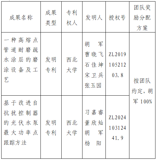 按照《乐投平台促进科技成果转化实施办法》(西大科〔2019〕5号)相关规定,拟对我校化工学院胡军教授作为成果负责人2项发明专利权实施转化,现将相关信息公示如下: