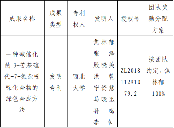 按照《乐投平台促进科技成果转化实施办法》(西大科〔2019〕5号)相关规定,拟对我校化工学院焦林郁教授作为成果负责人的1项发明专利权实施转化,现将相关信息公示如下: