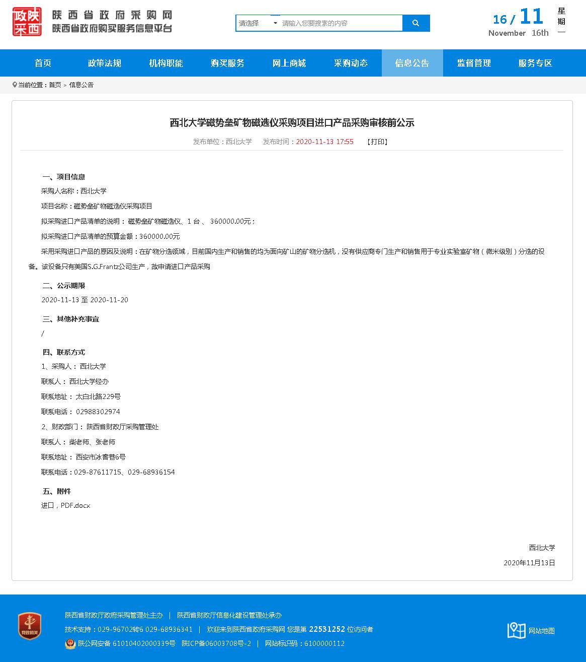 乐投平台磁势垒矿物磁选仪采购项目进口产品采购审核前公示