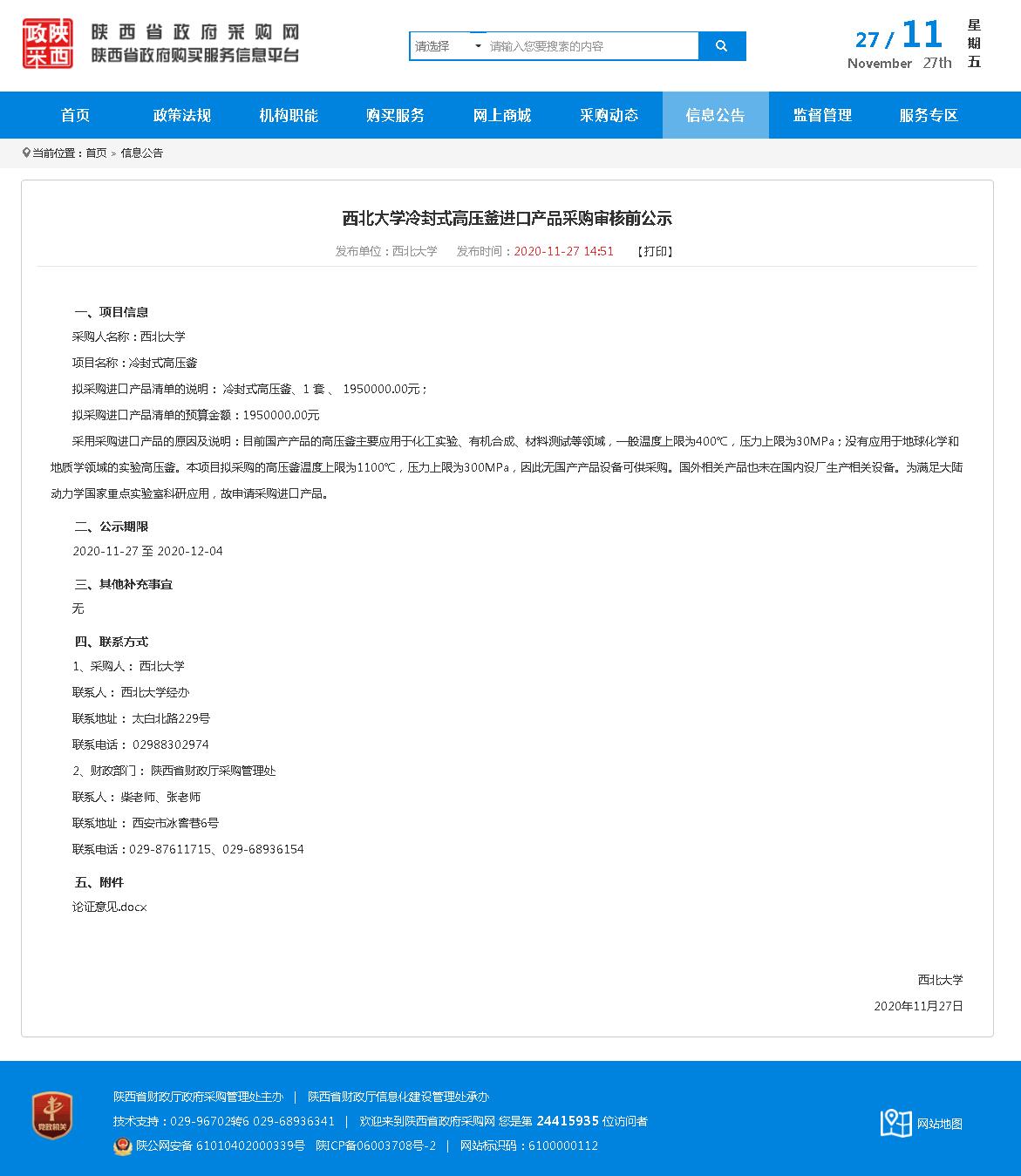 乐投平台冷封式高压釜进口产品采购审核前公示