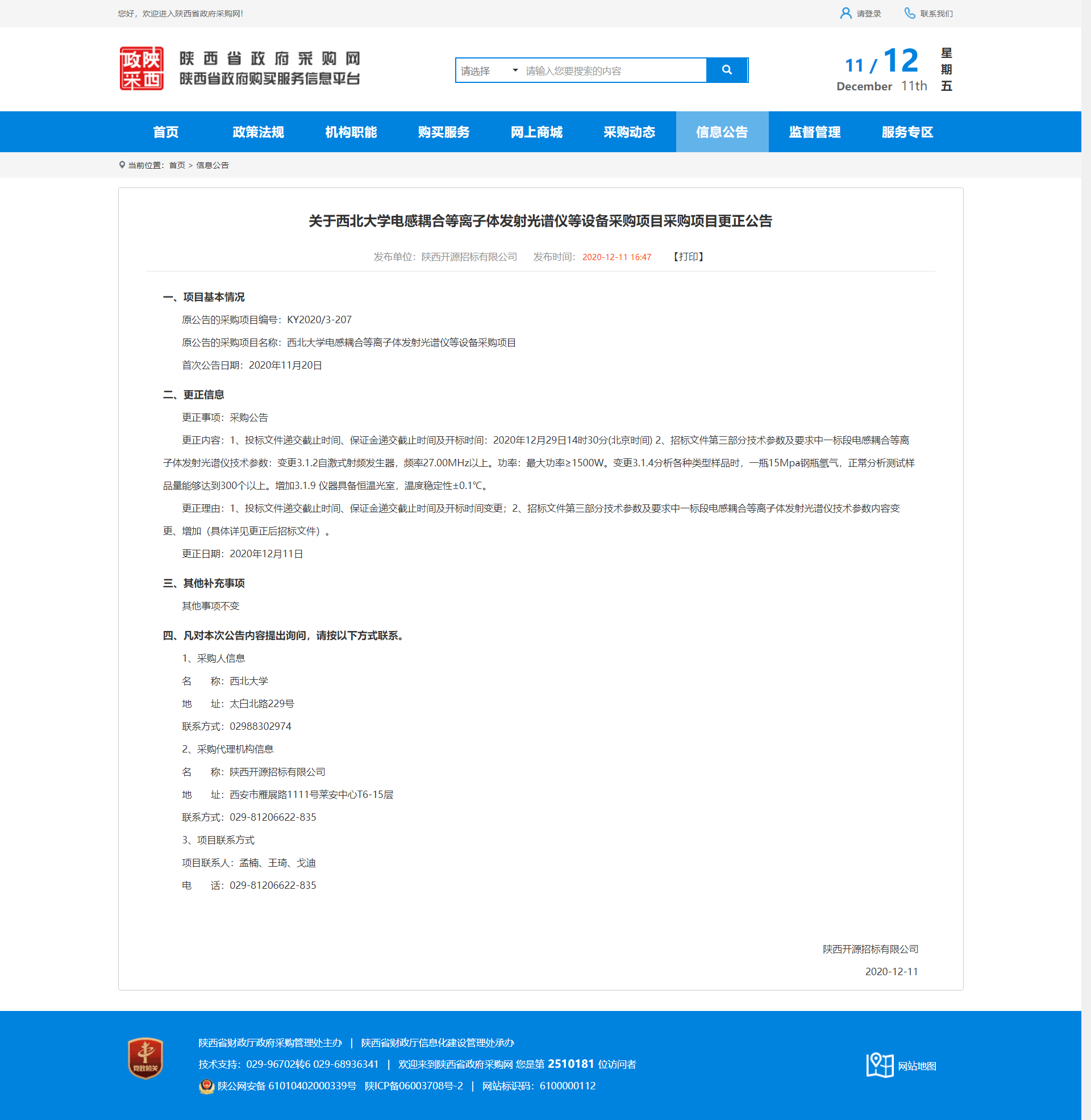 关于乐投平台电感耦合等离子体发射光谱仪等设备采购项目采购项目更正公告 作者: 编辑:薛利娟 时间:2020-12-11 原公告地址:http://www.ccgp-shaanxi.gov.cn/notice/noticeDetail.do?noticeguid=8a85be3375d5d589017650e8e44672f0