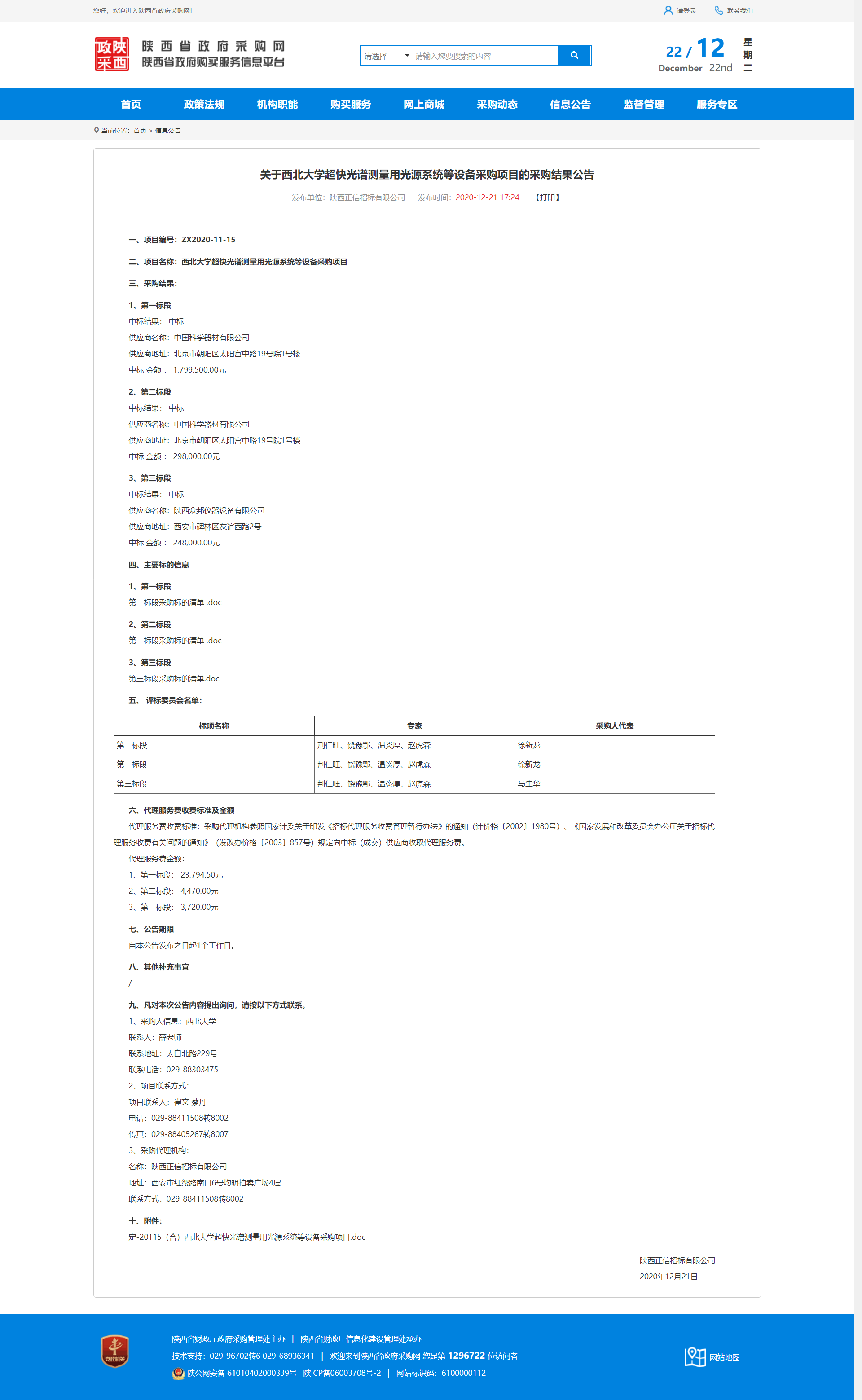 关于乐投平台超快光谱测量用光源系统等设备采购项目的采购结果公告 作者: 编辑:薛利娟 时间:2020-12-22 原公告地址:http://www.ccgp-shaanxi.gov.cn/notice/noticeDetail.do?noticeguid=8a85be33765f9dd001768497df5d65ae