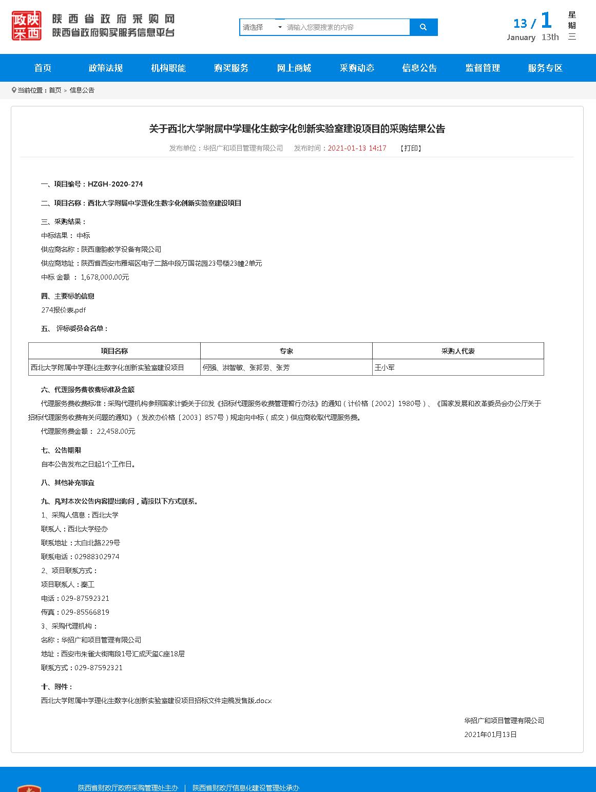 关于乐投平台附属中学理化生数字化创新实验室建设项目的采购结果公告
