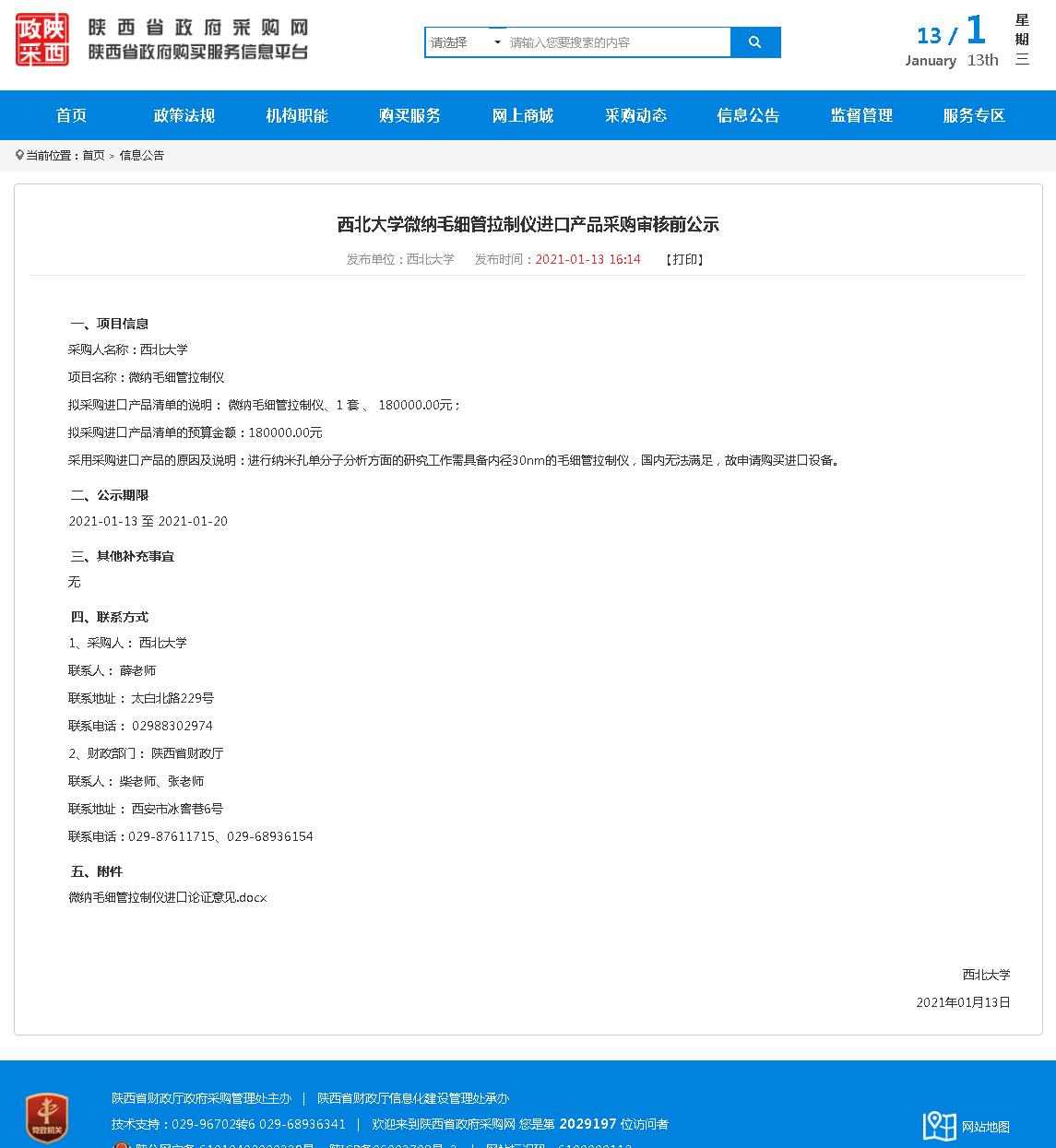乐投平台微纳毛细管拉制仪进口产品采购审核前公示