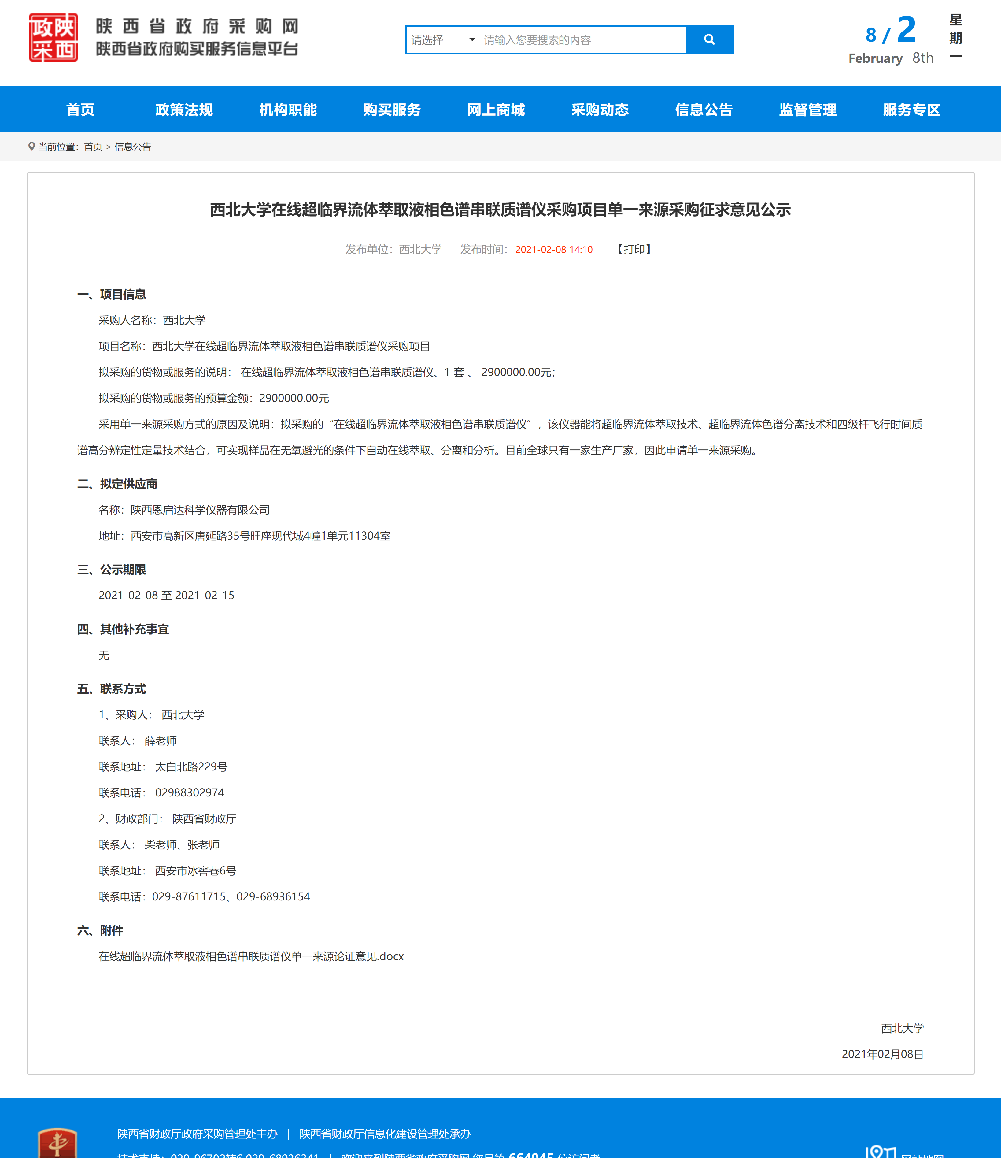乐投平台在线超临界流体萃取液相色谱串联质谱仪采购项目单一来源采购征求意见公示