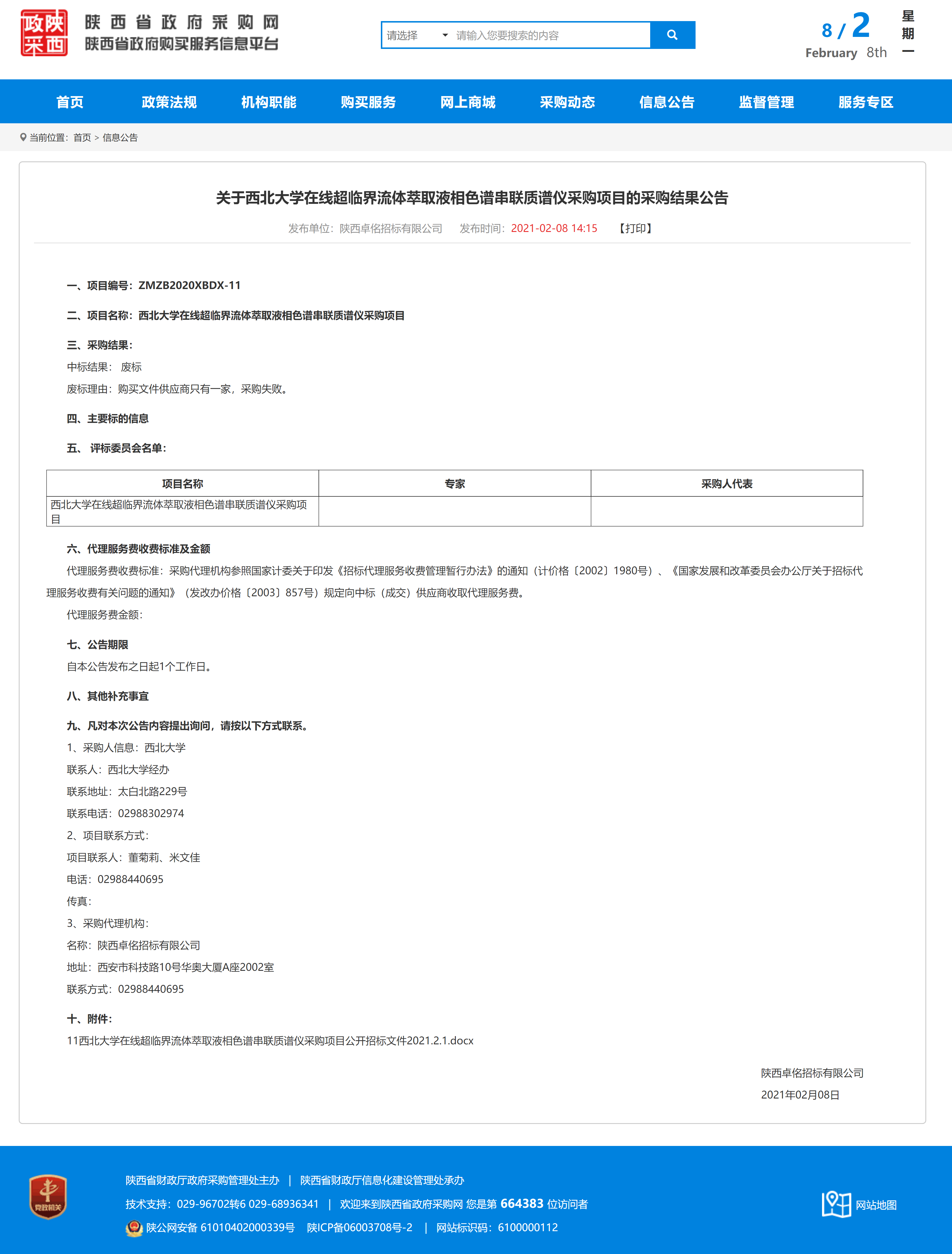 乐投平台在线超临界流体萃取液相色谱串联质谱仪采购项目的采购结果公告