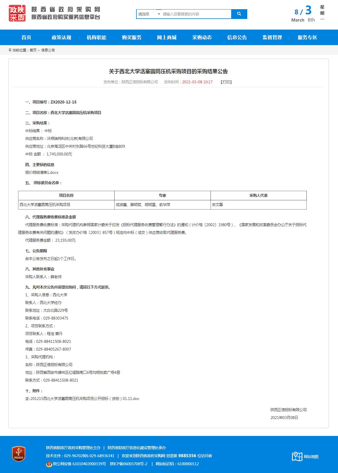 乐投平台活塞圆筒压机采购项目的采购结果公告