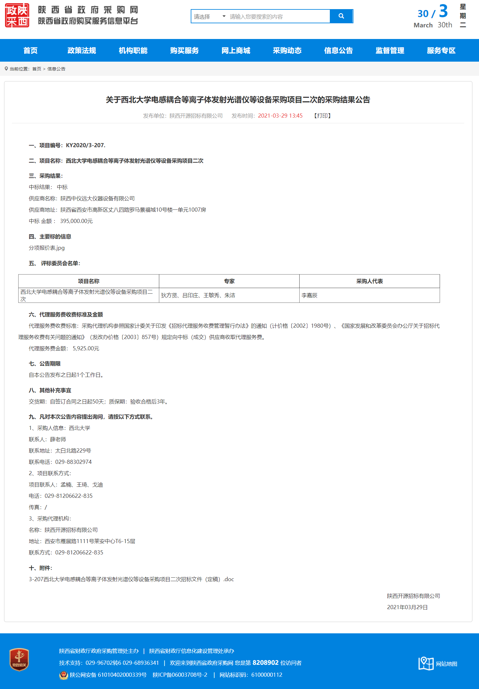 乐投平台电感耦合等离子体发射光谱仪等设备采购项目二次的采购结果公告