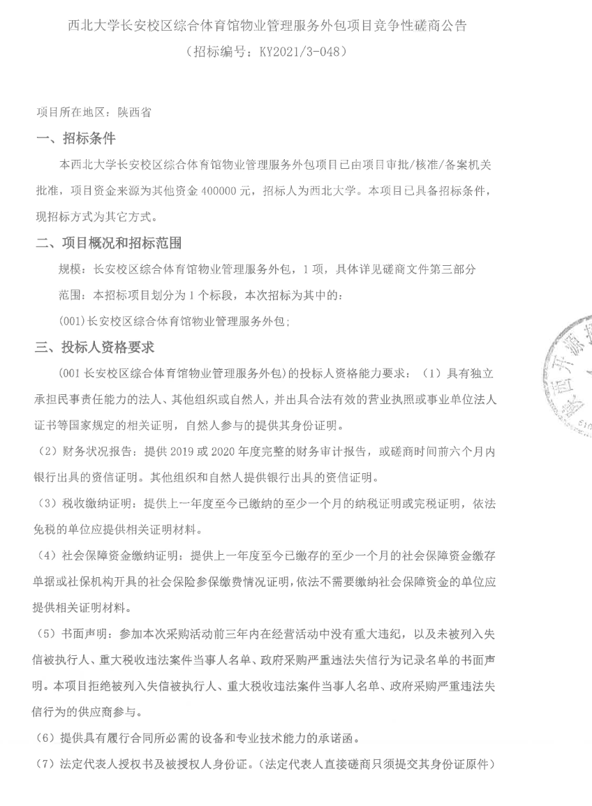 乐投平台长安校区综合体育馆物业管理服务外包项目竞争性磋商公告