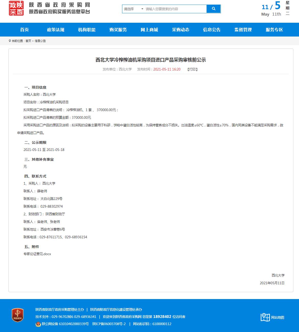 乐投平台冷榨榨油机采购项目进口产品采购审核前公示