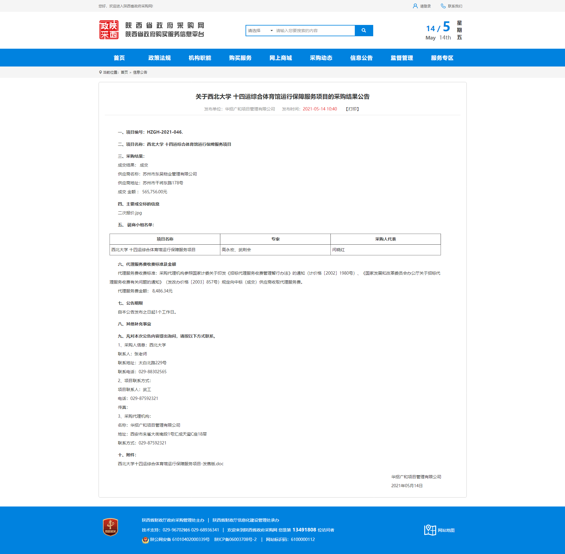 关于乐投平台十四运综合体育馆运行保障服务项目的采购结果公告