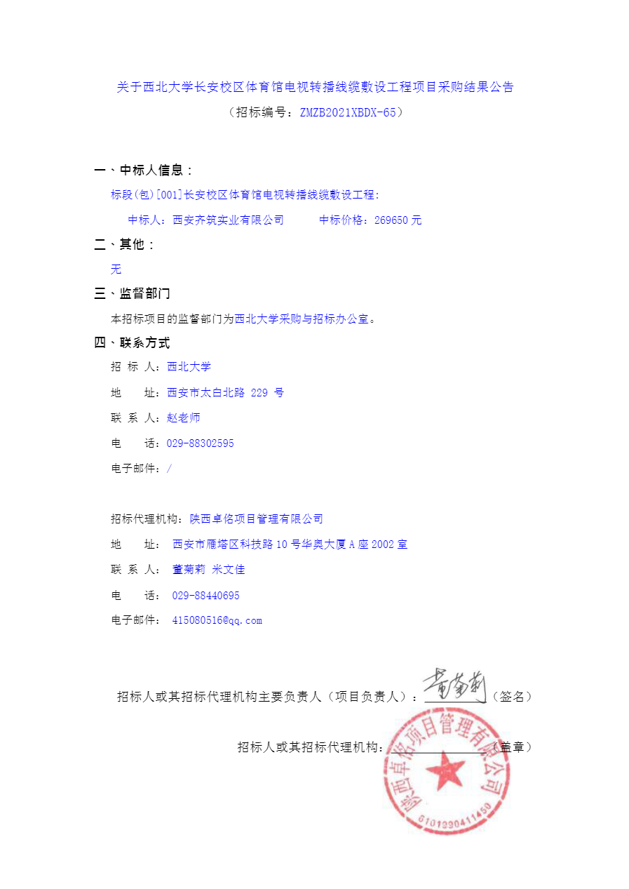 关于乐投平台长安校区体育馆电视转播线缆敷设工程项目采购结果公告