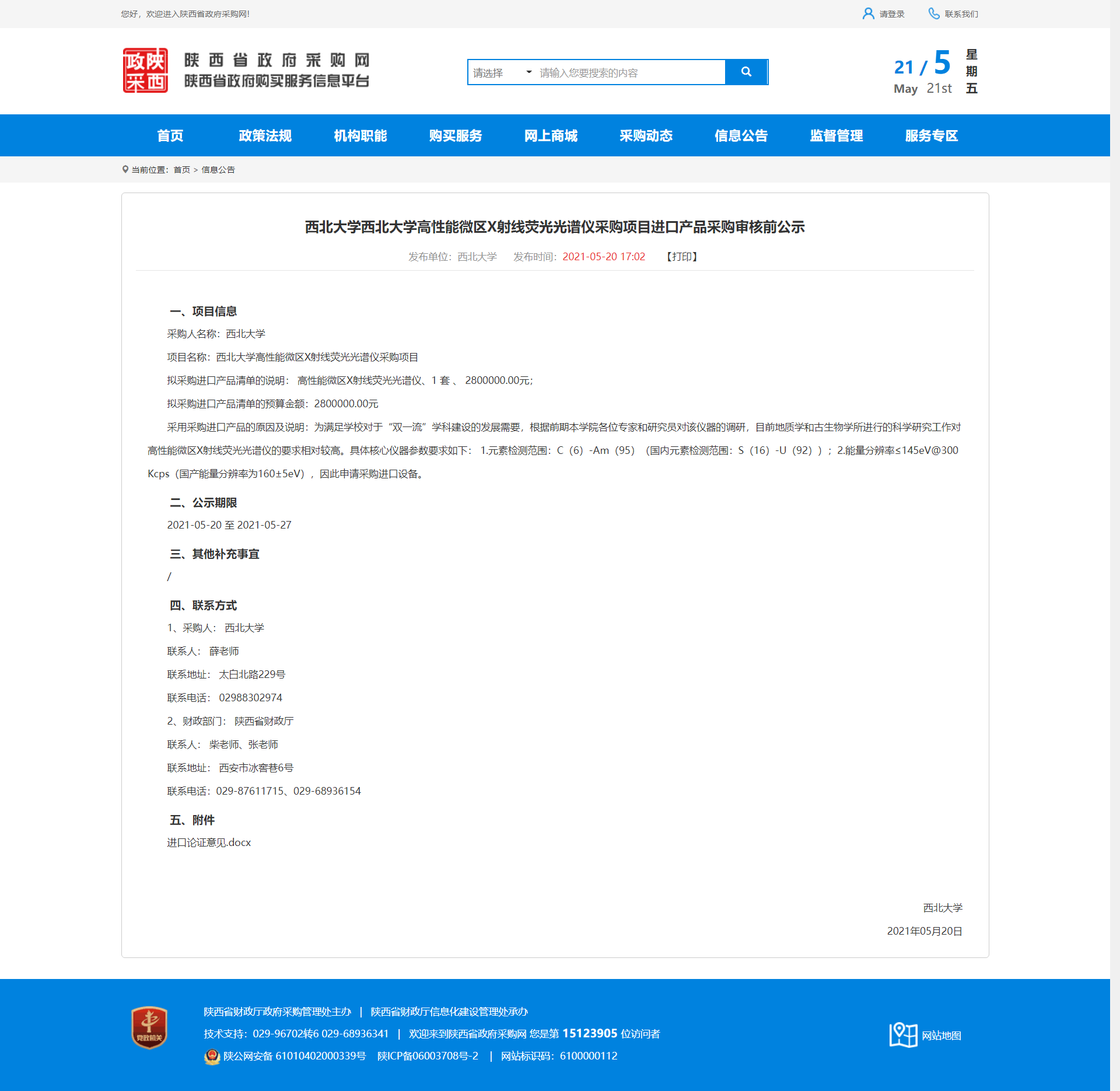 乐投平台高性能微区X射线荧光光谱仪采购项目进口产品采购审核前公示 作者: 编辑:薛利娟 时间:2021-05-21 原公告地址:http://www.ccgp-shaanxi.gov.cn/notice/noticeDetail.do?noticeguid=8a85be33791baa0f017988f95b141335