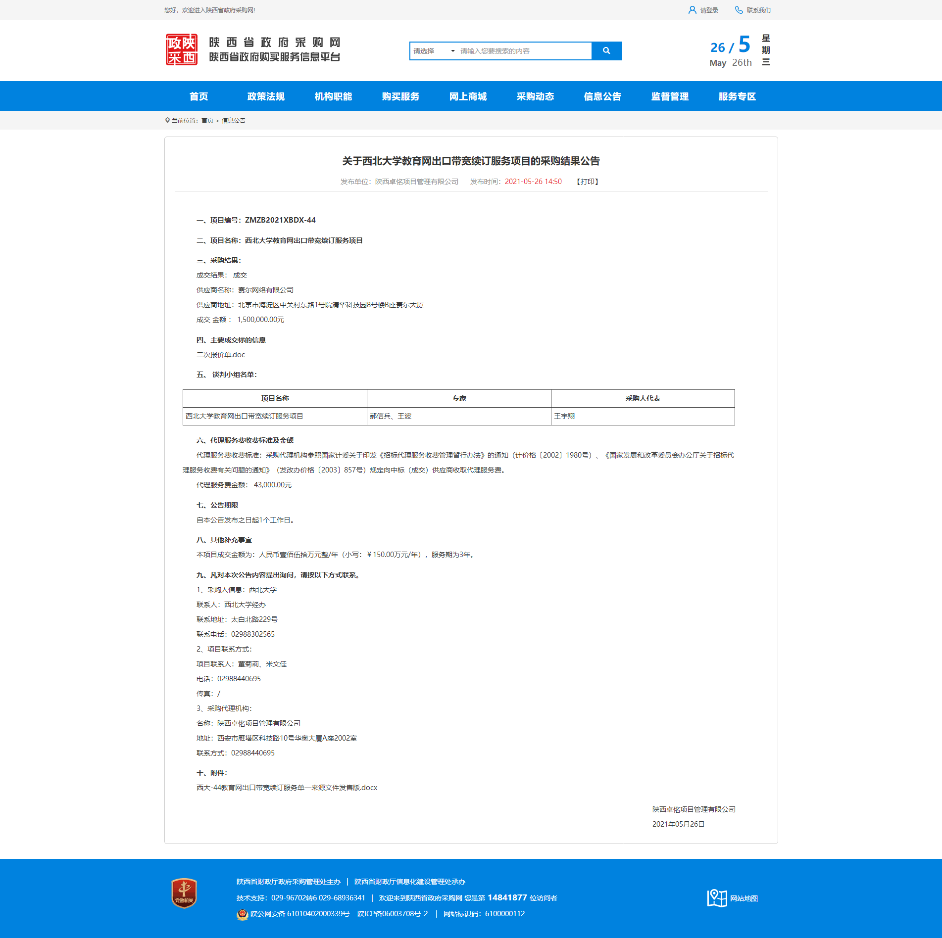 关于乐投平台教育网出口带宽续订服务项目的采购结果公告