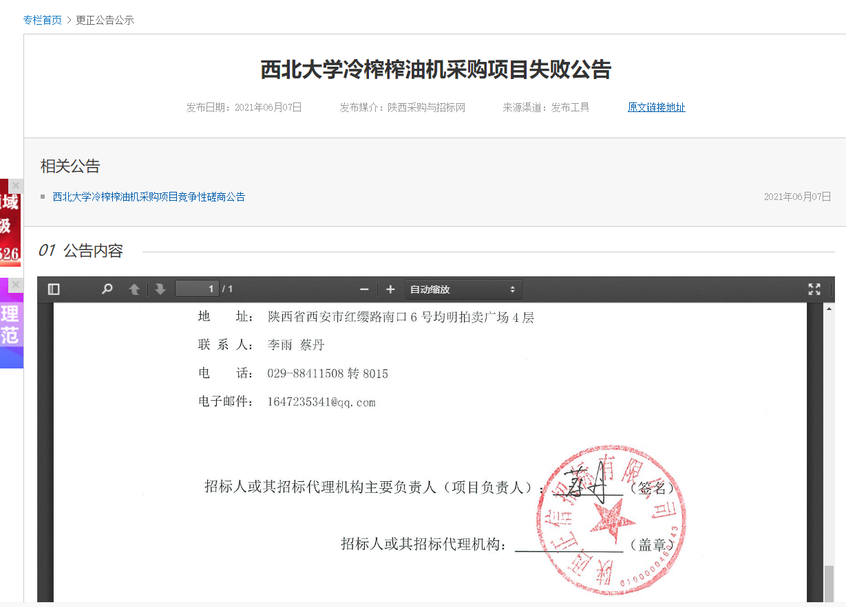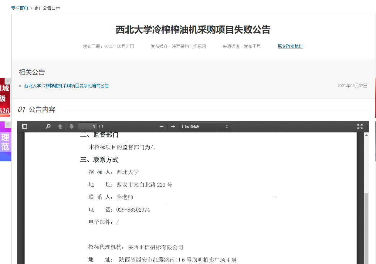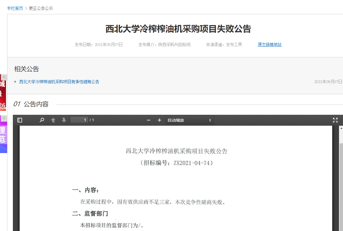 乐投平台冷榨榨油机采购项目失败公告 作者: 编辑:薛利娟 时间:2021-06-07 原公告地址:http://bulletin.sntba.com/changeBulletin/2021-06-07/305152.html