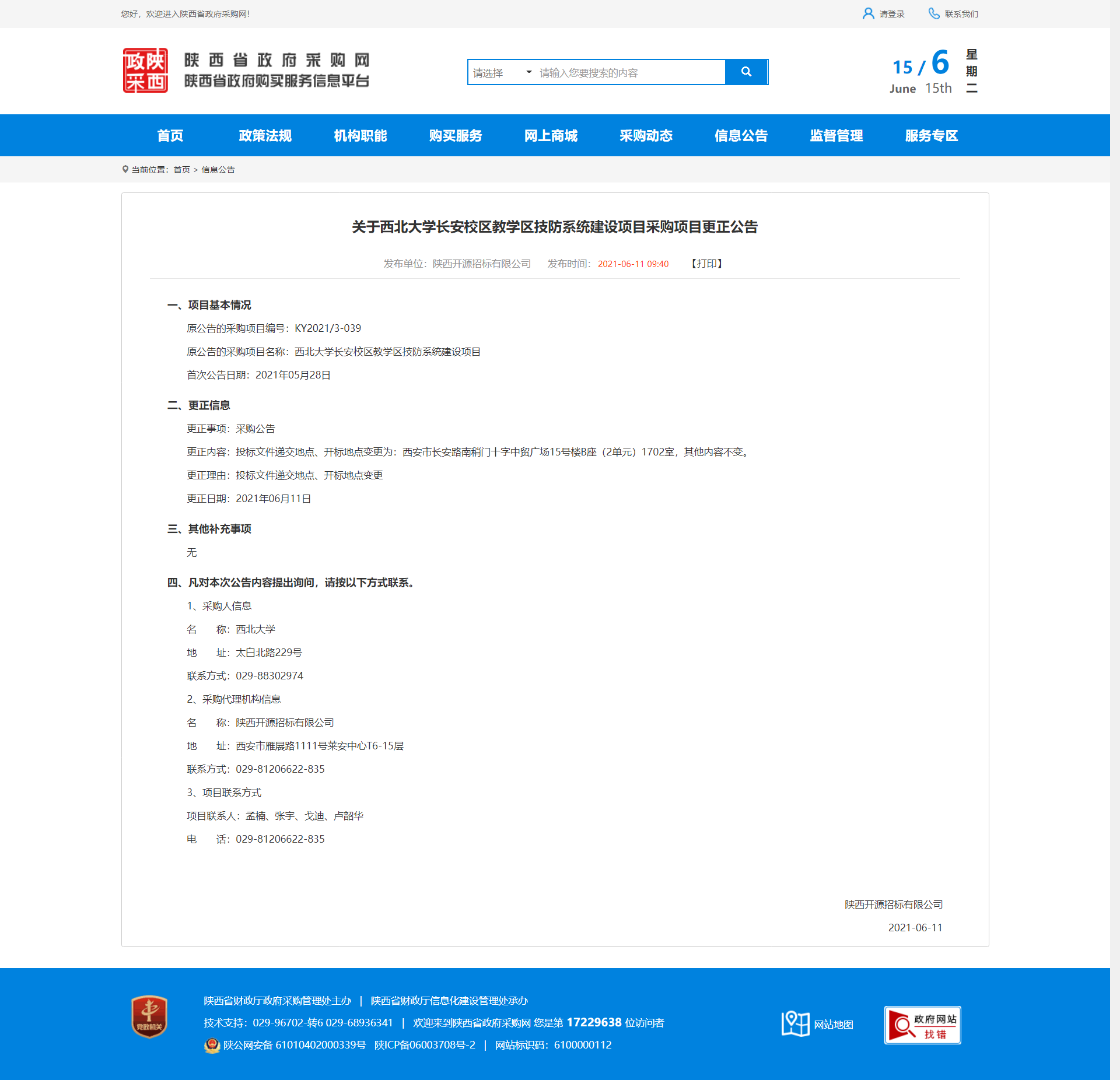 关于乐投平台长安校区教学区技防系统建设项目采购项目更正公告 作者: 编辑:薛利娟 时间:2021-06-15 原公告地址:http://www.ccgp-shaanxi.gov.cn/notice/noticeDetail.do?noticeguid=8a85be33791baa0f0179f8ab30151d42