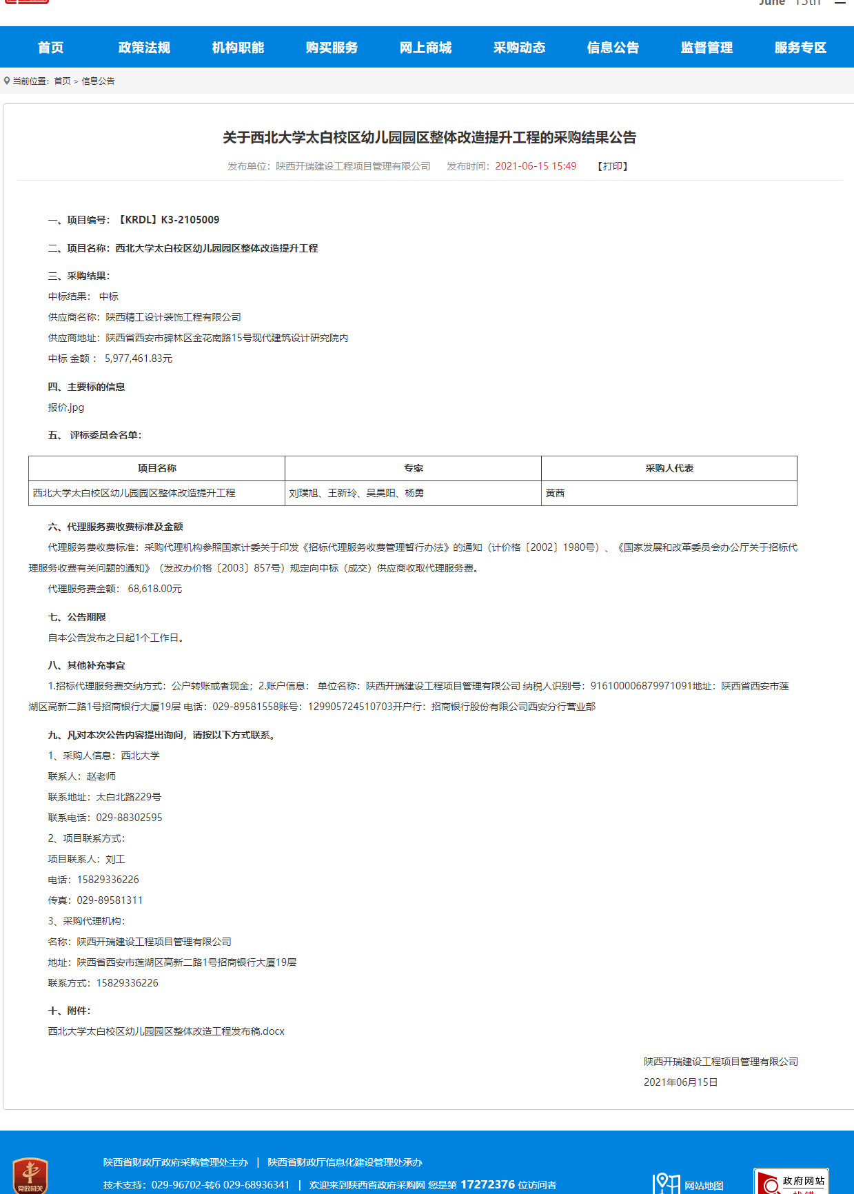 乐投平台太白校区幼儿园园区整体改造提升工程的采购结果公告