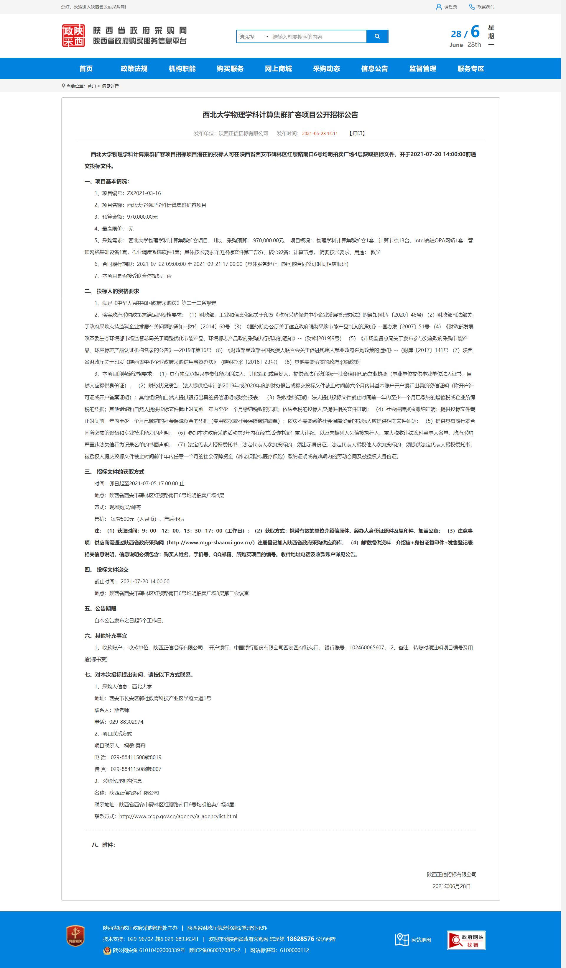 乐投平台物理学科计算集群扩容项目公开招标公告 作者: 编辑:采购与招标办公室 时间:2021-06-28 原公告地址:http://www.ccgp-shaanxi.gov.cn/notice/noticeDetail.do?noticeguid=8a85be33791baa0f017a50f2f9203176