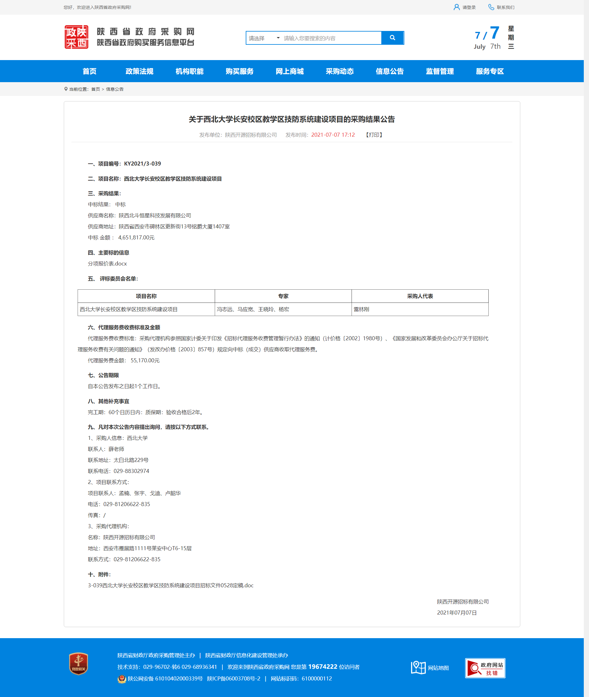关于乐投平台长安校区教学区技防系统建设项目的采购结果公告 作者: 编辑:采购与招标办公室 时间:2021-07-07 原公告地址:http://www.ccgp-shaanxi.gov.cn/notice/noticeDetail.do?noticeguid=8a85be337a79620e017a7fff10cb41ef