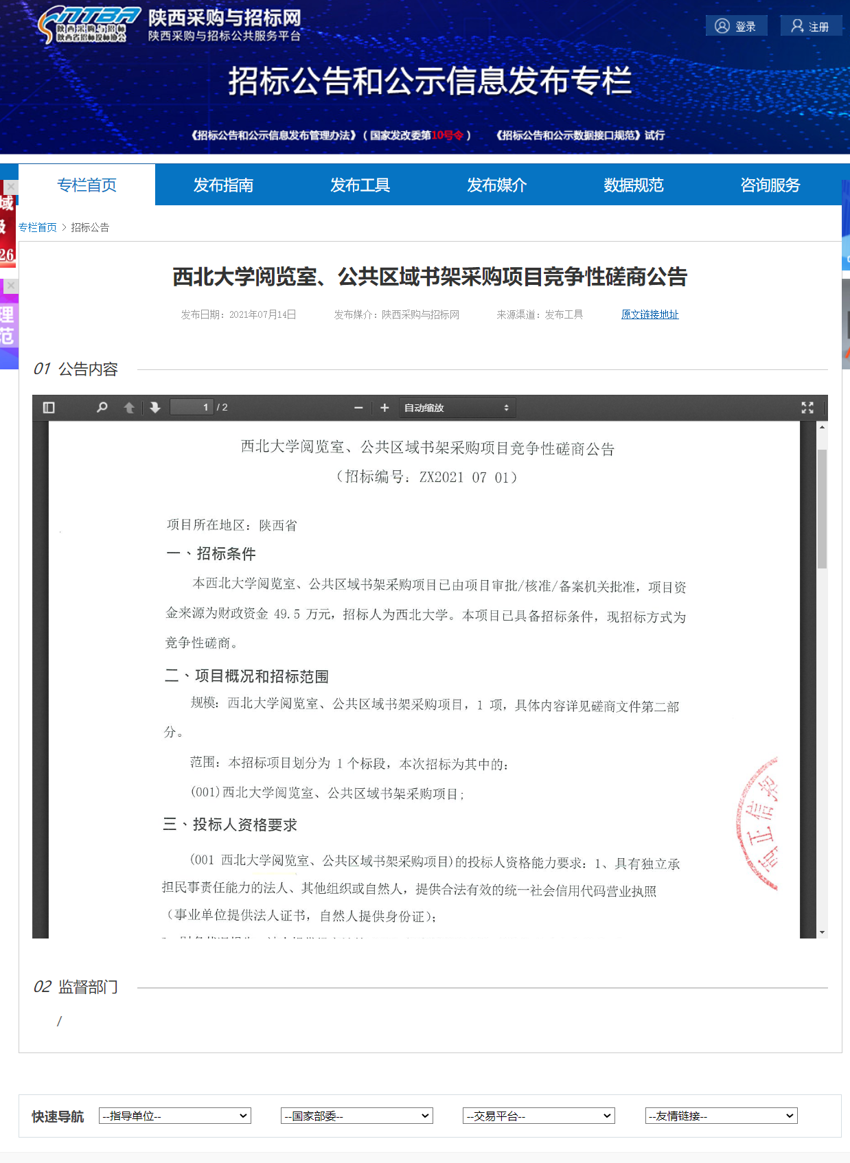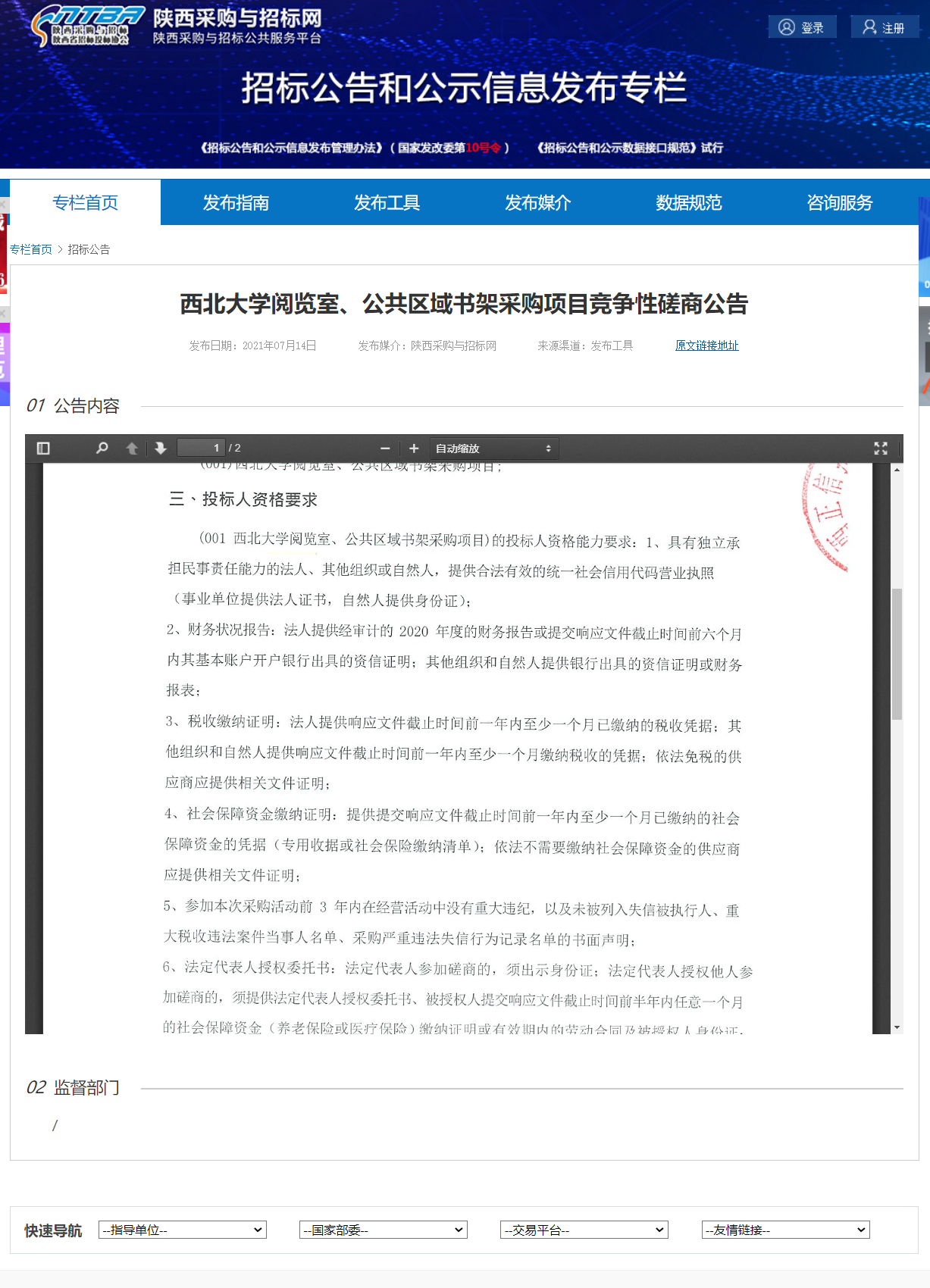 乐投平台阅览室、公共区域书架采购项目竞争性磋商公告 作者: 编辑:采购与招标办公室 时间:2021-07-15 原公告地址:http://bulletin.sntba.com/biddingBulletin/2021-07-14/318895.html