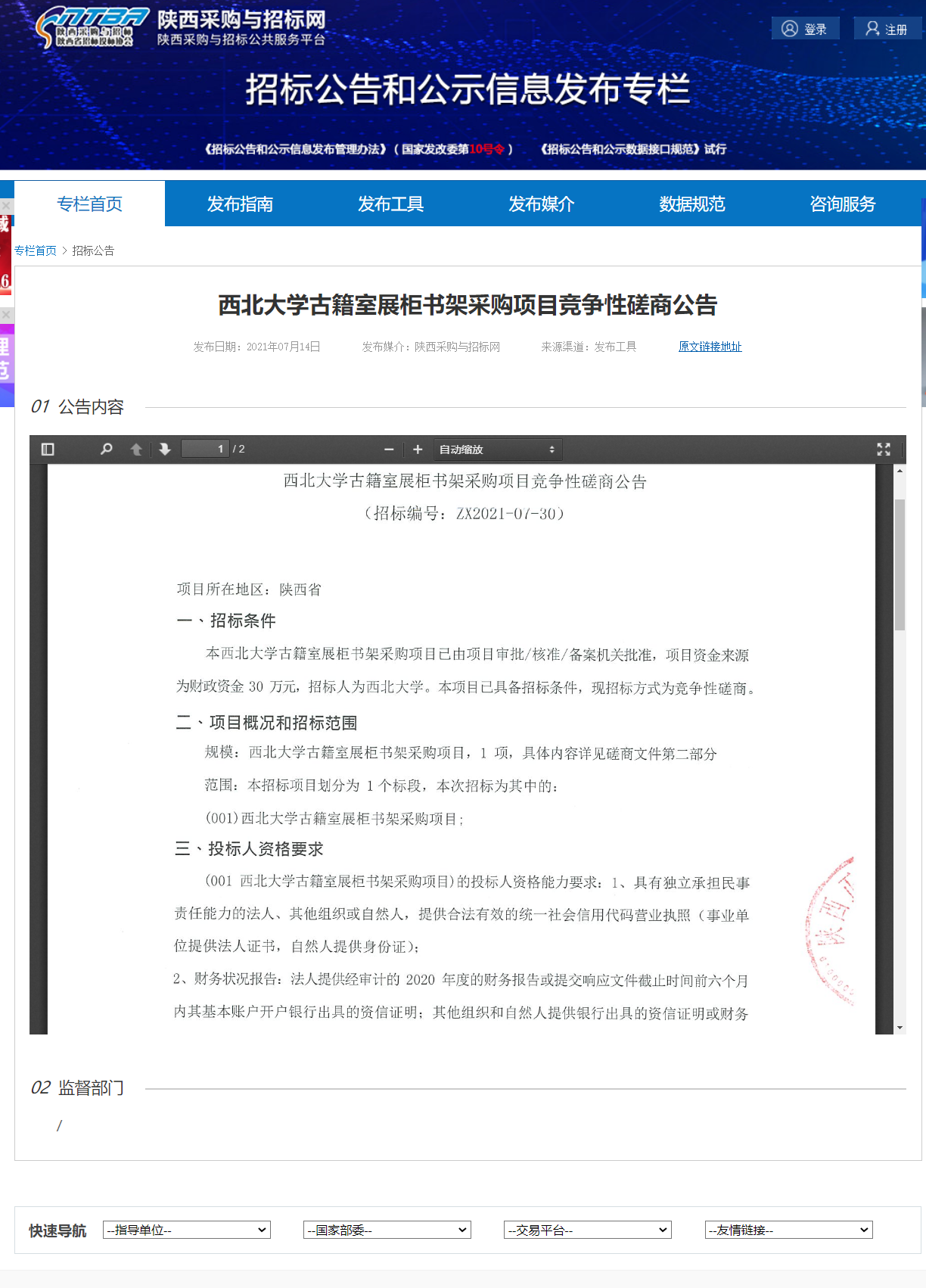 乐投平台古籍室展柜书架采购项目竞争性磋商公告 作者: 编辑:采购与招标办公室 时间:2021-07-15 原公告地址:http://bulletin.sntba.com/biddingBulletin/2021-07-14/318898.html
