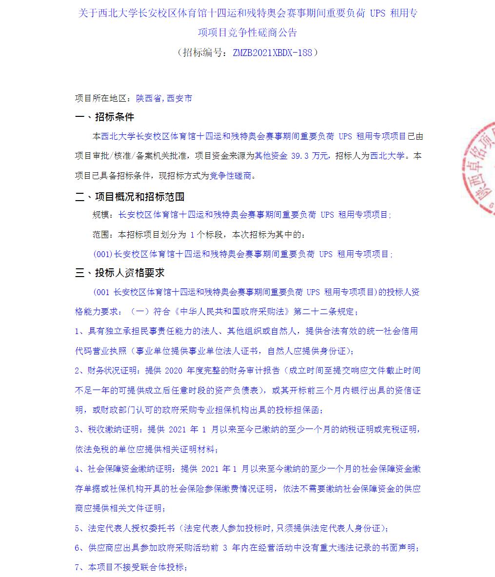 关于乐投平台长安校区体育馆十四运和残特奥会赛事期间重要负荷UPS租用专项项目竞争性磋商公告
