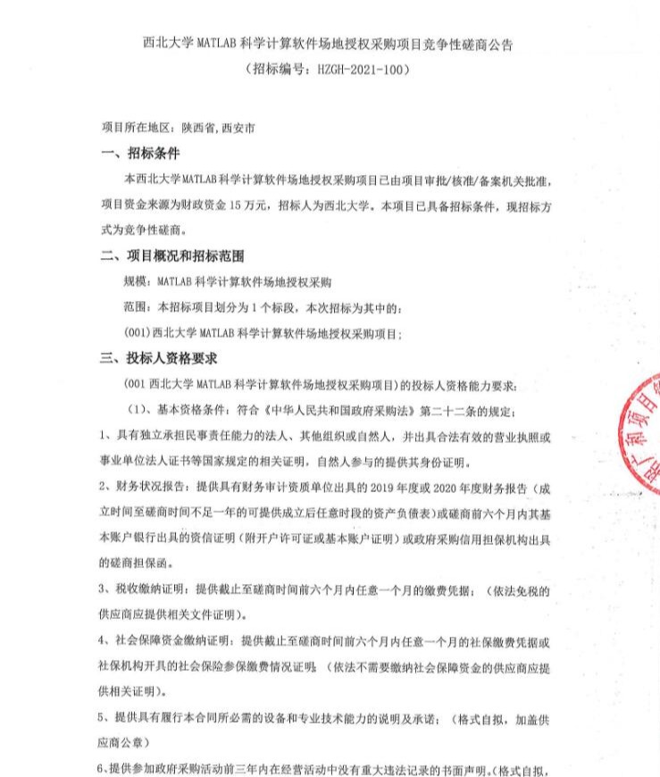 关于乐投平台MATLAB科学计算软件场地授权采购项目竞争性磋商公告