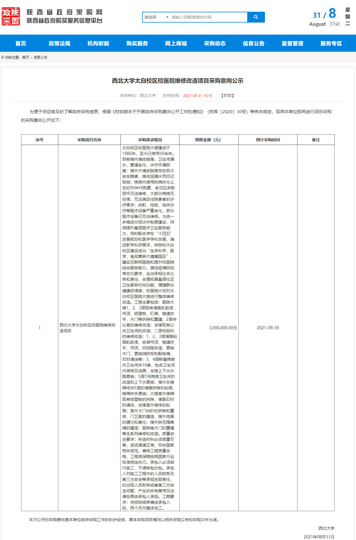 乐投平台太白校区校医院维修改造项目采购意向公示