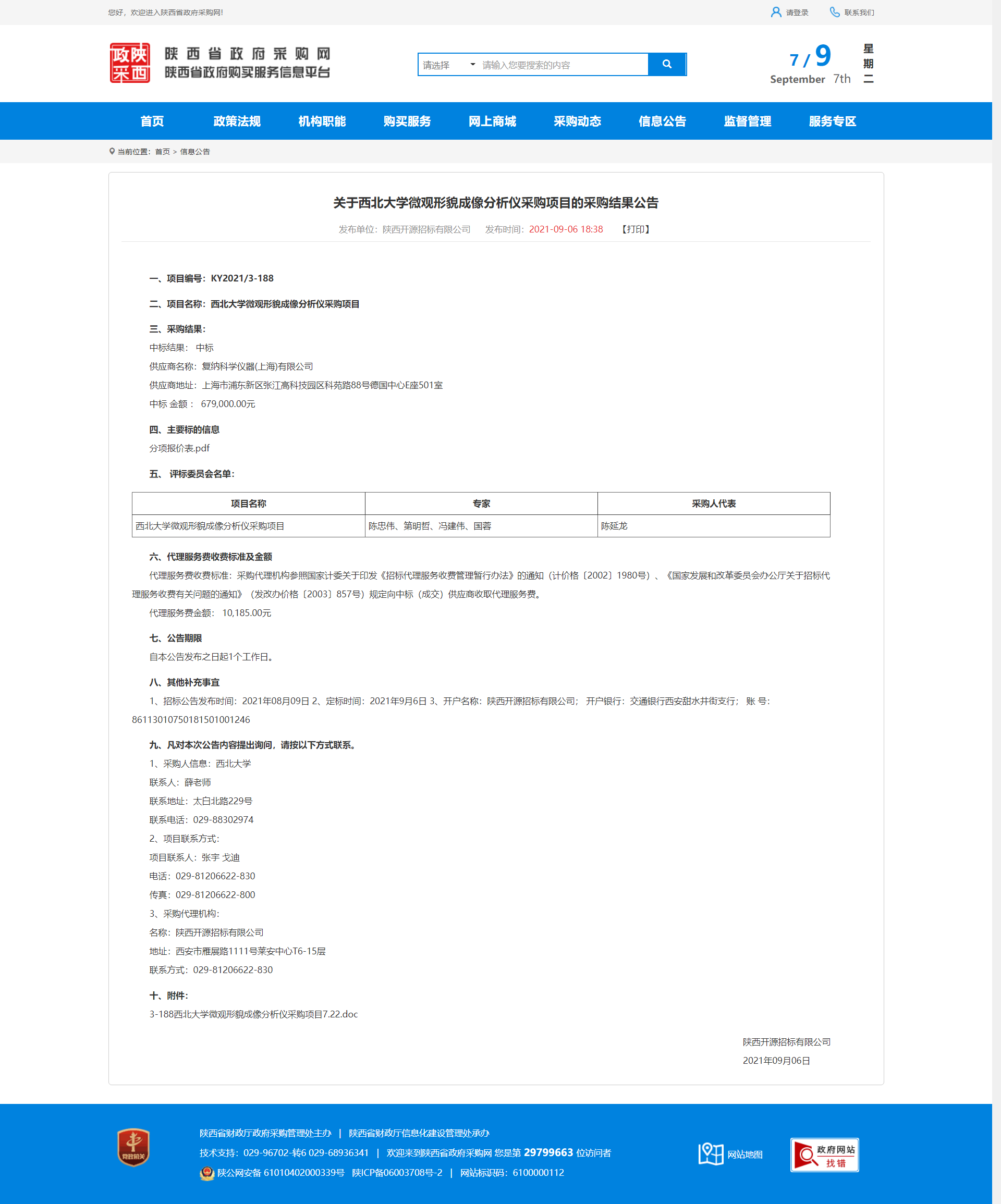 关于乐投平台微观形貌成像分析仪采购项目的采购结果公告 作者: 编辑:采购与招标办公室 时间:2021-09-07 原公告地址:http://www.ccgp-shaanxi.gov.cn/notice/noticeDetail.do?noticeguid=8a85be347b04610d017bbaac92114f2e