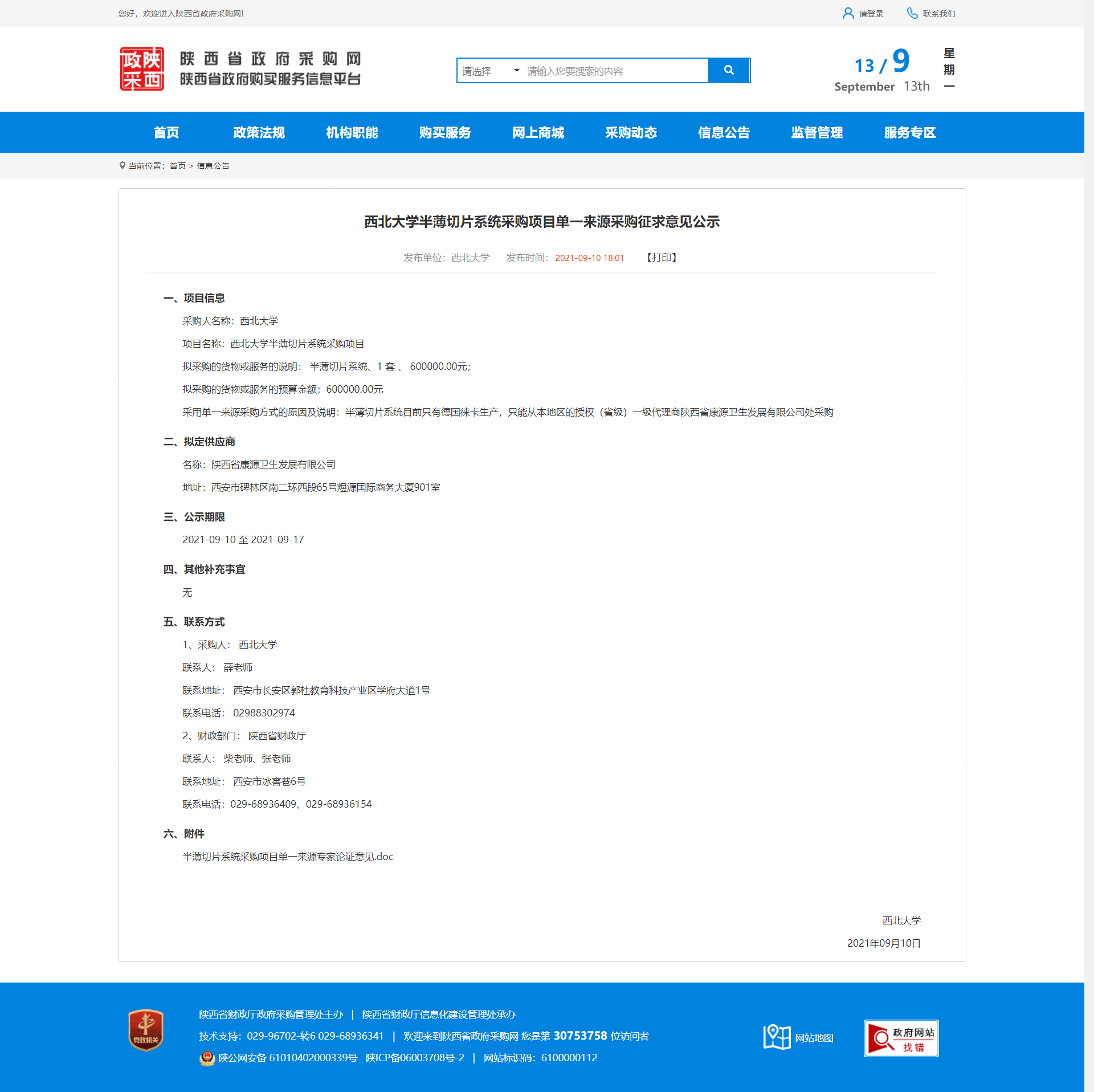 乐投平台半薄切片系统采购项目单一来源采购征求意见公示 作者: 编辑:采购与招标办公室 时间:2021-09-13 原公告地址:http://www.ccgp-shaanxi.gov.cn/notice/noticeDetail.do?noticeguid=8a85be347bc00296017bcf1dba3d1059