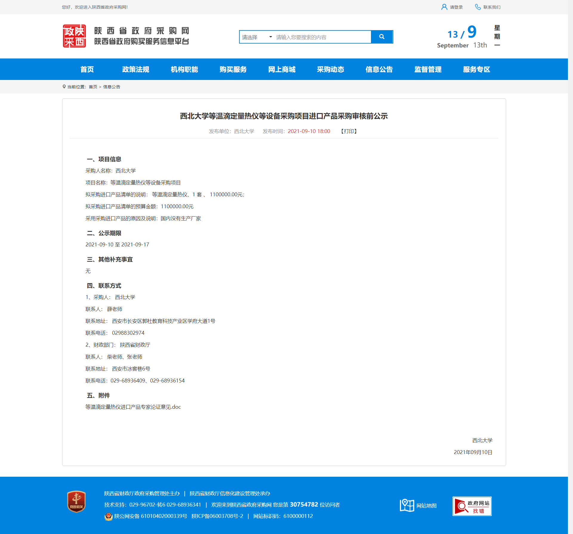 乐投平台等温滴定量热仪等设备采购项目进口产品采购审核前公示 作者: 编辑:采购与招标办公室 时间:2021-09-13 原公告地址:http://www.ccgp-shaanxi.gov.cn/notice/noticeDetail.do?noticeguid=8a85be347bc00296017bcf17c5ca1019