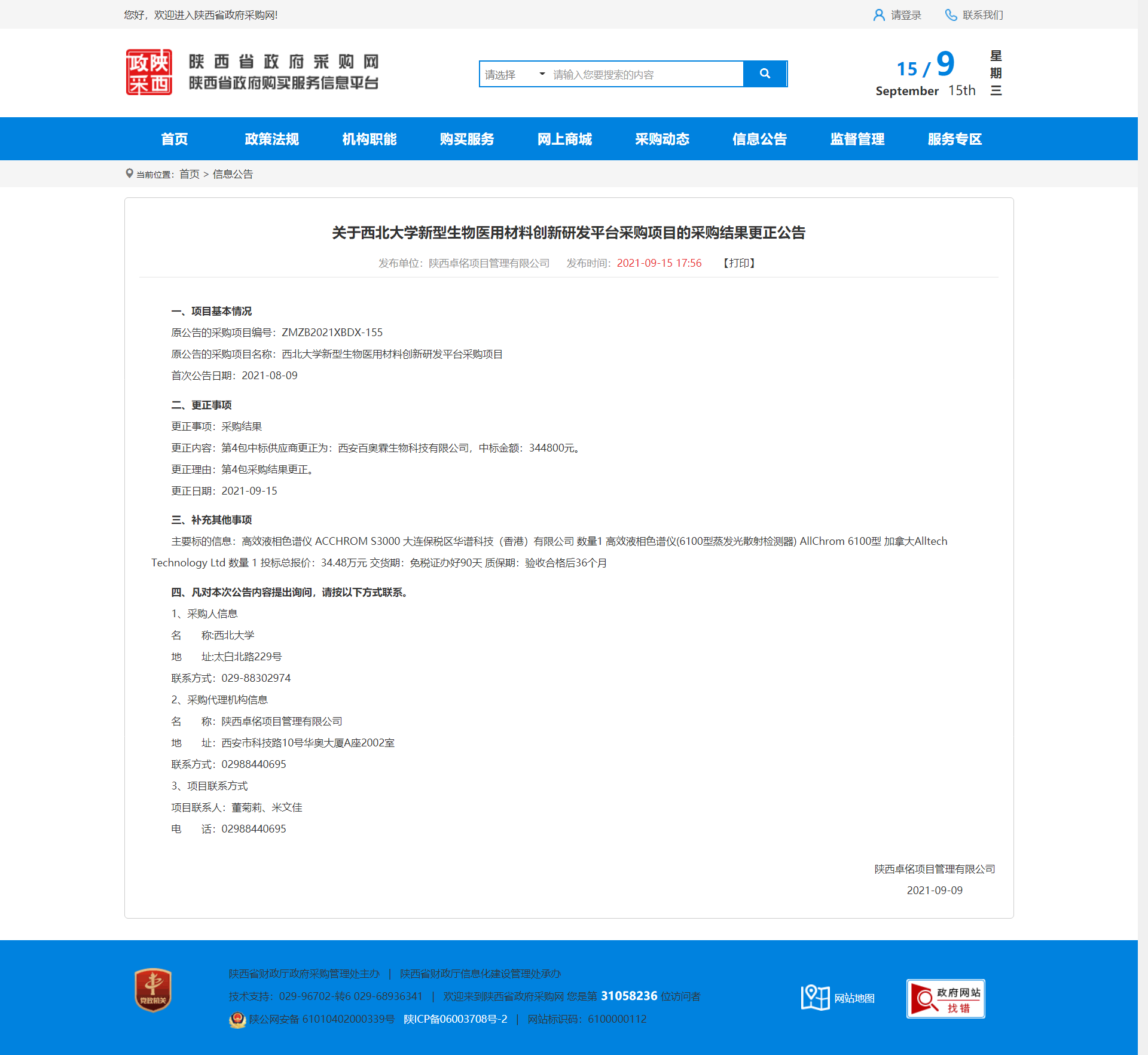 关于乐投平台新型生物医用材料创新研发平台采购项目的采购结果更正公告 作者: 编辑:采购与招标办公室 时间:2021-09-15 原公告地址:http://www.ccgp-shaanxi.gov.cn/notice/noticeDetail.do?noticeguid=8a85be347bc00296017be8d43def369b