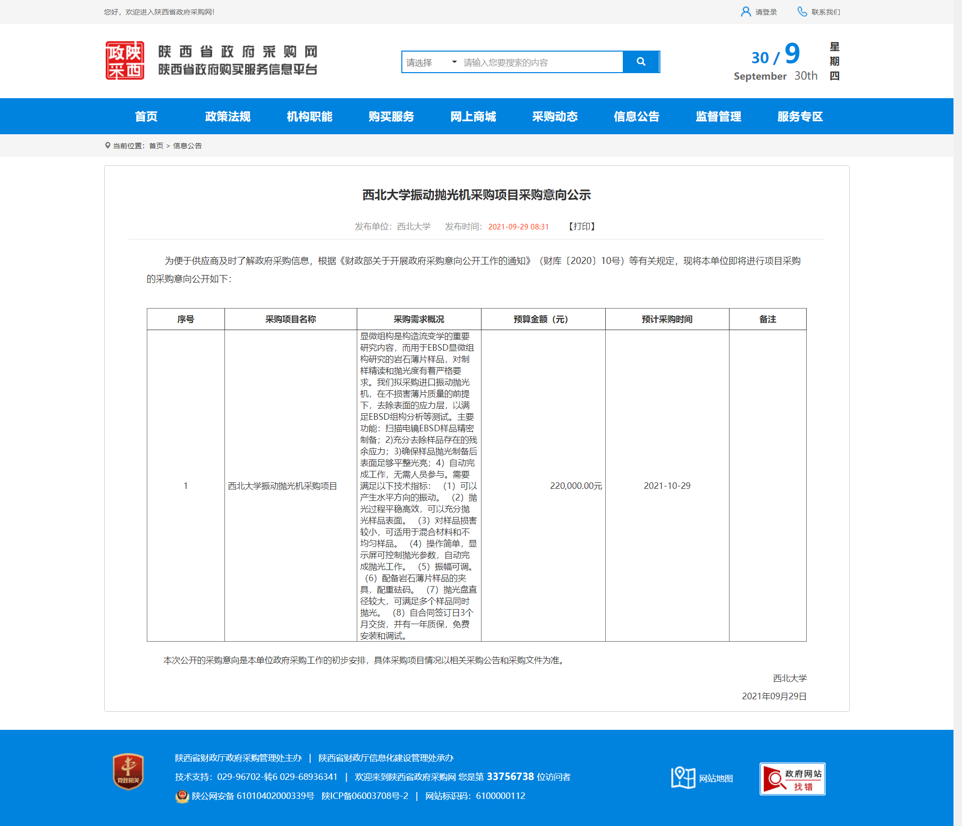 乐投平台振动抛光机采购项目采购意向公示 作者: 编辑:采购与招标办公室 时间:2021-09-30 原公告地址:http://www.ccgp-shaanxi.gov.cn/notice/noticeDetail.do?noticeguid=8a85be337c20d0b4017c2ef28a5109d6