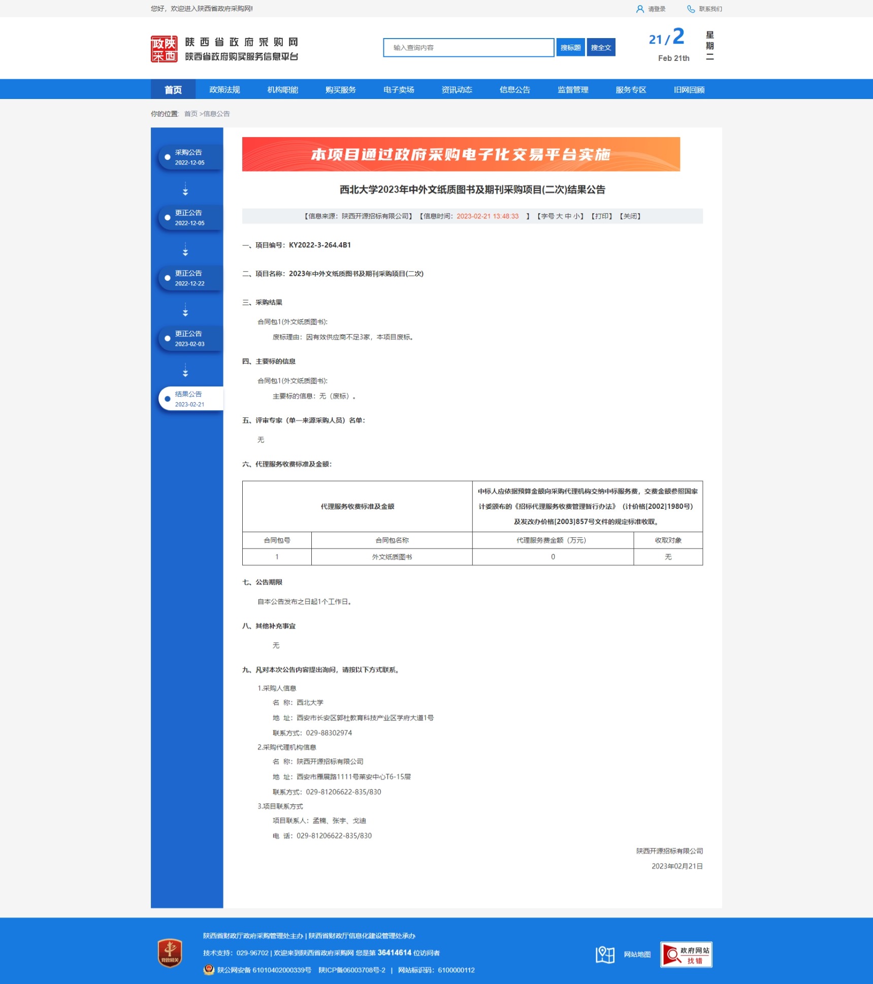 乐投平台2023年中外文纸质图书及期刊采购项目(二次)结果公告 作者: 编辑:采购与招标办公室 时间:2023-02-21 原公告链接:http://www.ccgp-shaanxi.gov.cn/freecms/site/shaanxi/ggxx/info/2023/8a69c672865ced8c0186724a037f638f.html?noticeType=001006¬iceId=37842b27-b1ac-11ed-9a8e-08c0eb20c666