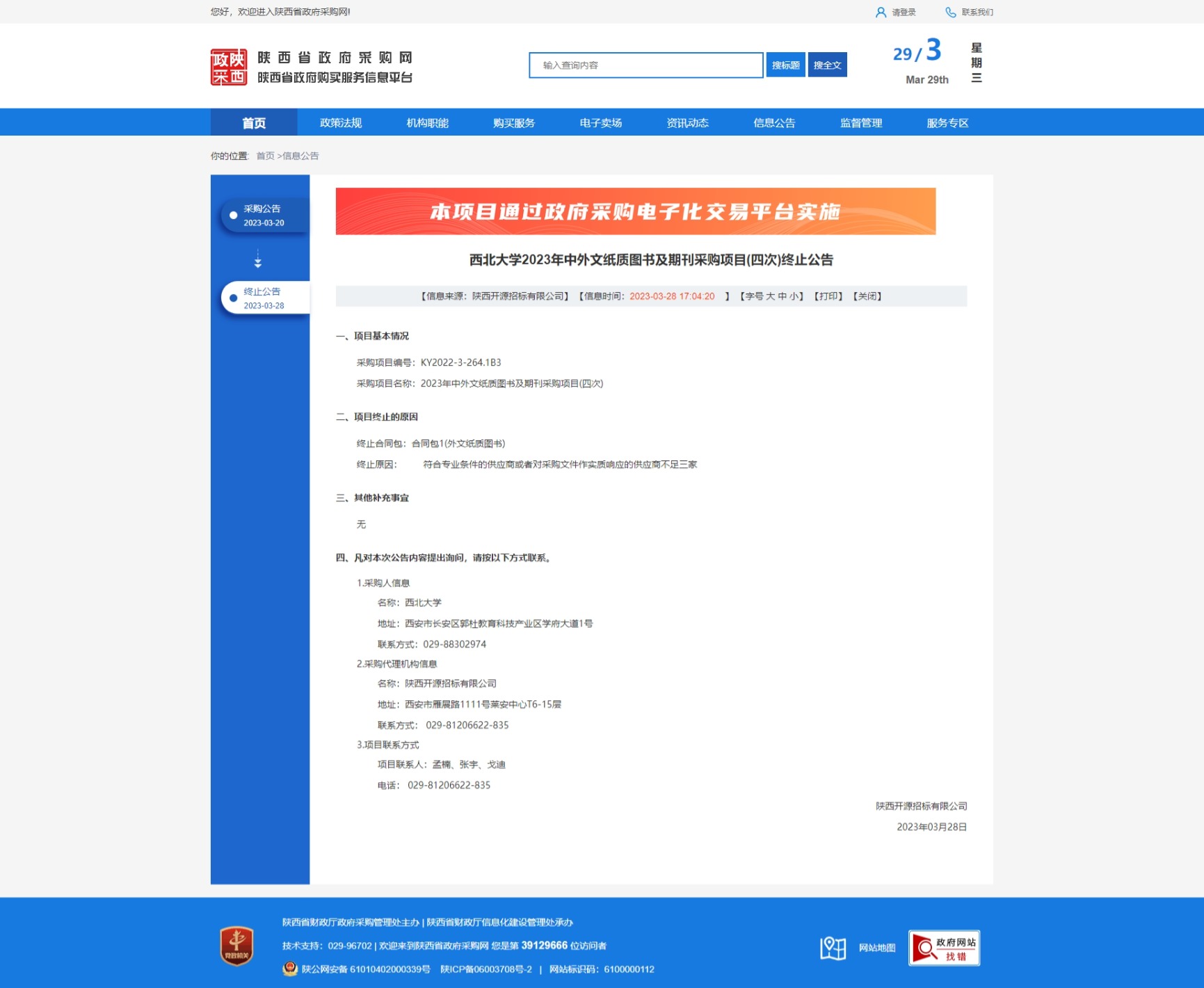 乐投平台2023年中外文纸质图书及期刊采购项目(四次)终止公告 作者: 编辑:采购与招标办公室 时间:2023-03-29 原公告链接:http://www.ccgp-shaanxi.gov.cn/freecms/site/shaanxi/ggxx/info/2023/8a69c402865ce80c0187274b628268bb.html?noticeType=001004¬iceId=705c8589-cd48-11ed-9a8e-08c0eb20c666