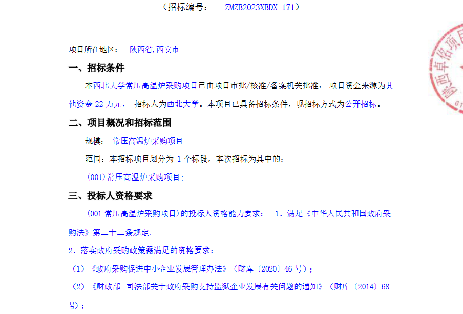 乐投平台常压高温炉采购项目公开招标公告 作者: 编辑:采购与招标办公室 时间:2023-07-11 原公告链接:http://bulletin.sntba.com/biddingBulletin/2023-07-10/582742.html
