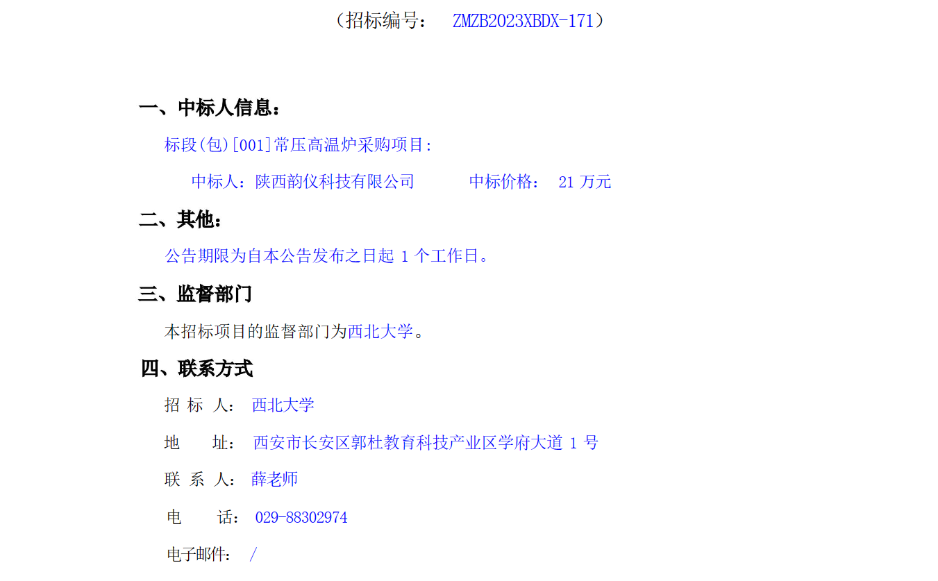 乐投平台常压高温炉采购项目结果公告 作者: 编辑:采购与招标办公室 时间:2023-08-01 原公告链接:http://bulletin.sntba.com/resultBulletin/2023-08-01/599542.html
