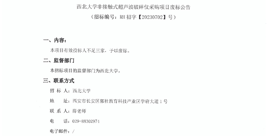 乐投平台非接触式超声波破碎仪采购项目废标公告 作者: 编辑:采购与招标办公室 时间:2023-09-07 原公告链接:http://bulletin.sntba.com/changeBulletin/2023-09-07/651428.html