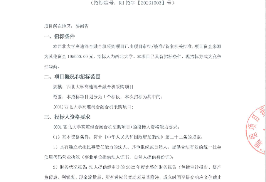 乐投平台高速混合融合机采购项目竞争性磋商公告 作者: 编辑:采购与招标办公室 时间:2023-10-18 原公告链接:http://bulletin.sntba.com/biddingBulletin/2023-10-17/735312.html