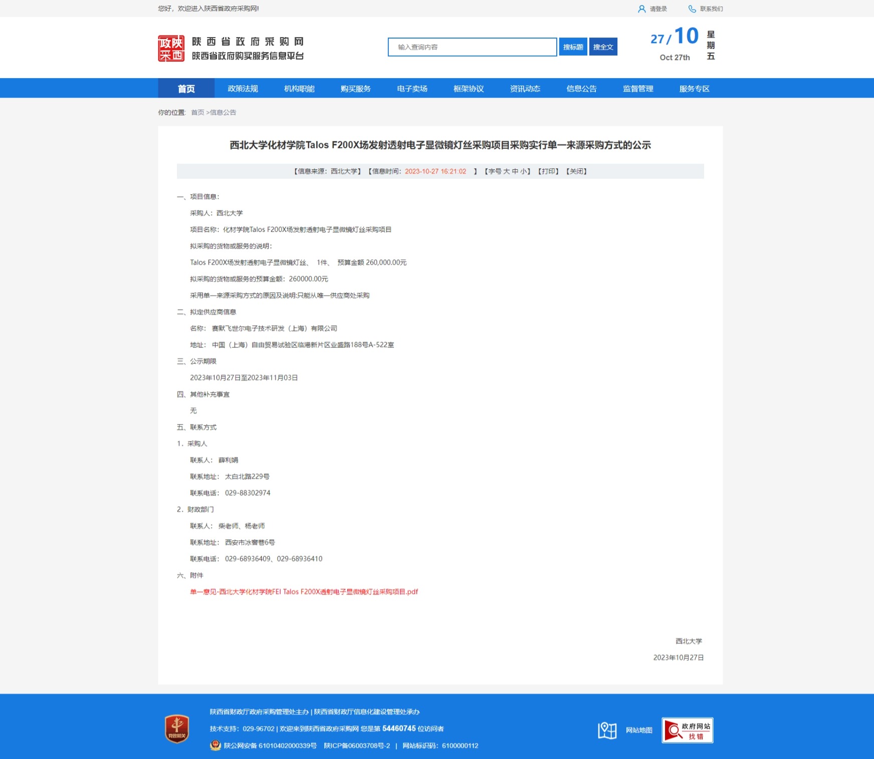 乐投平台化材学院Talos F200X场发射透射电子显微镜灯丝采购项目采购实行单一来源采购方式的公示 作者: 编辑:采购与招标办公室 时间:2023-10-27 原公告链接:http://www.ccgp-shaanxi.gov.cn/freecms/site/shaanxi/ggxx/info/2023/8a69c1288b6f04ea018b7035835c48ea.html?noticeType=001051¬iceId=11c24886-74a3-11ee-9a8e-08c0eb20c666