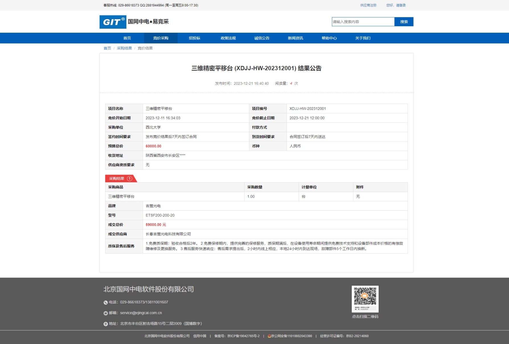 乐投平台三维精密平移台采购项目 (XDJJ-HW-202312001) 竞价结果公告 作者: 编辑: 时间:2023-12-21 原公告链接:http://www.ejingcai.com.cn/site/bidding/detail/7978