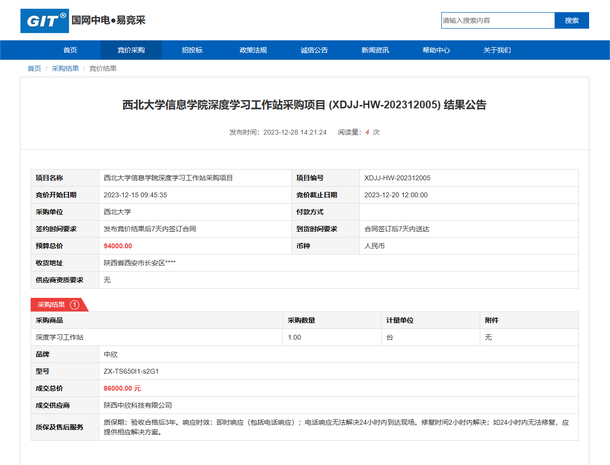 乐投平台信息学院深度学习工作站采购项目 (XDJJ-HW-202312005) 竞价结果公告 作者: 编辑:采购与招标办公室 时间:2023-12-28 原公告链接:https://www.ejingcai.com.cn/site/bidding/detail/8075