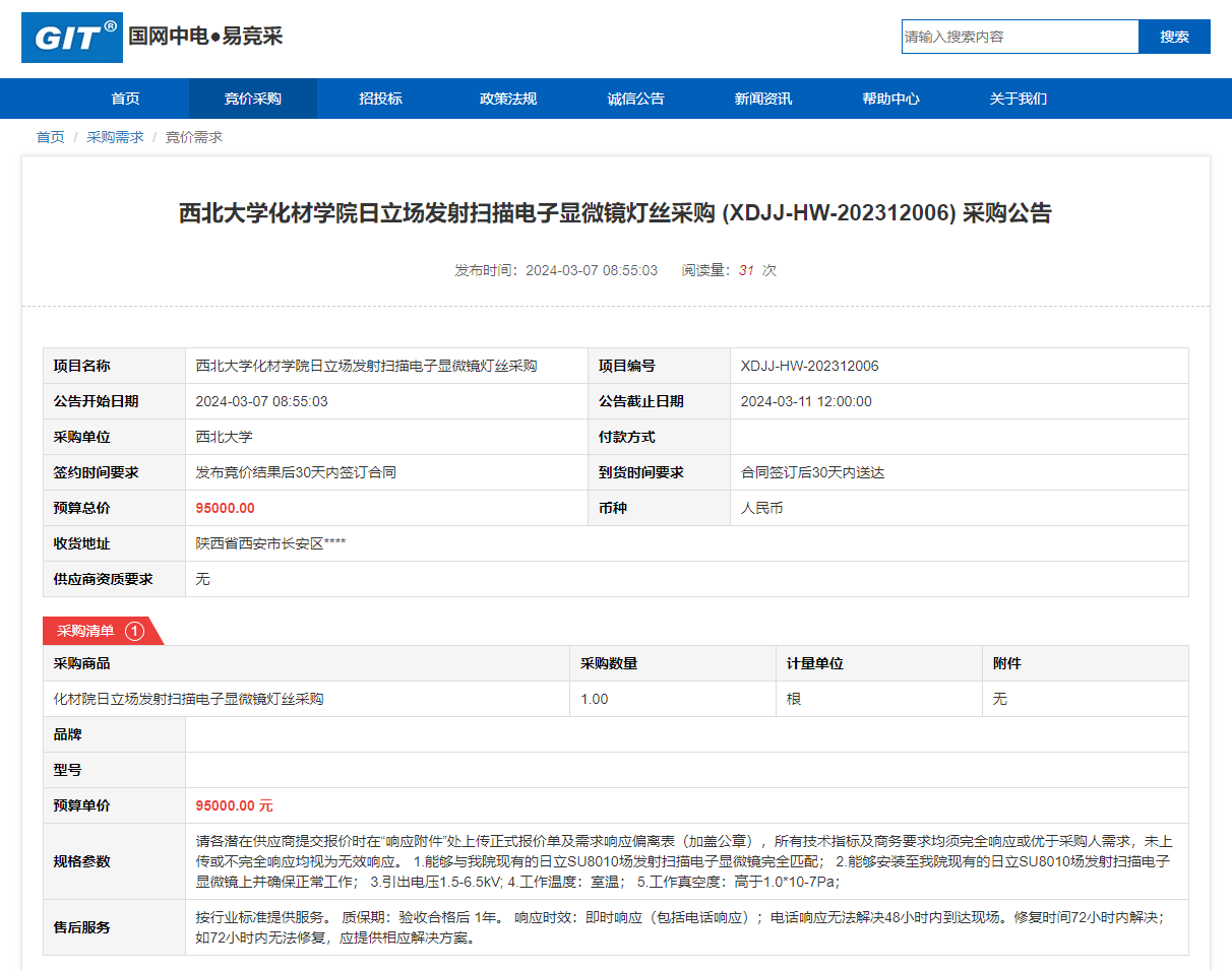 乐投平台化材学院日立场发射扫描电子显微镜灯丝采购 (XDJJ-HW-202312006)竞价公告 作者: 编辑: 时间:2024-03-07 原公告链接:https://www.ejingcai.com.cn/site/bidding/detail/8741
